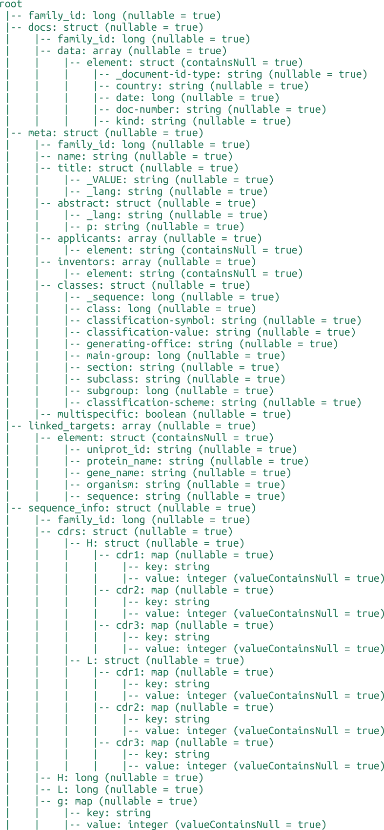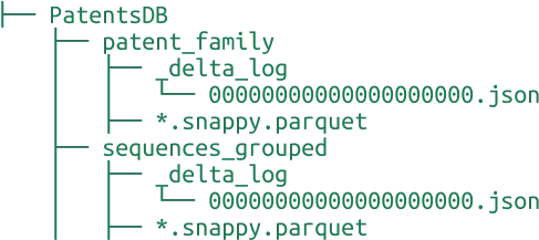 The Patents DB dataset is available in parquet/delta (delta.io) format streamlining the integration into data processing pipelines (using Apache Spark, Pandas, DuckDB). It consists of 2 types of entities:
