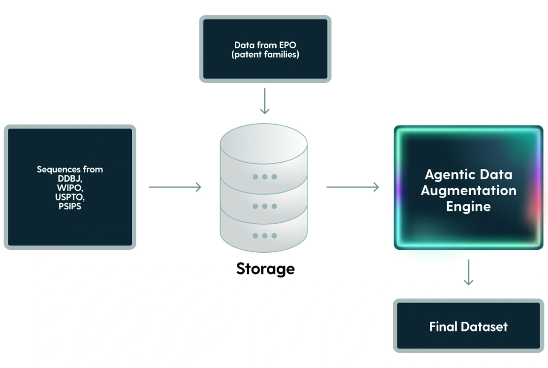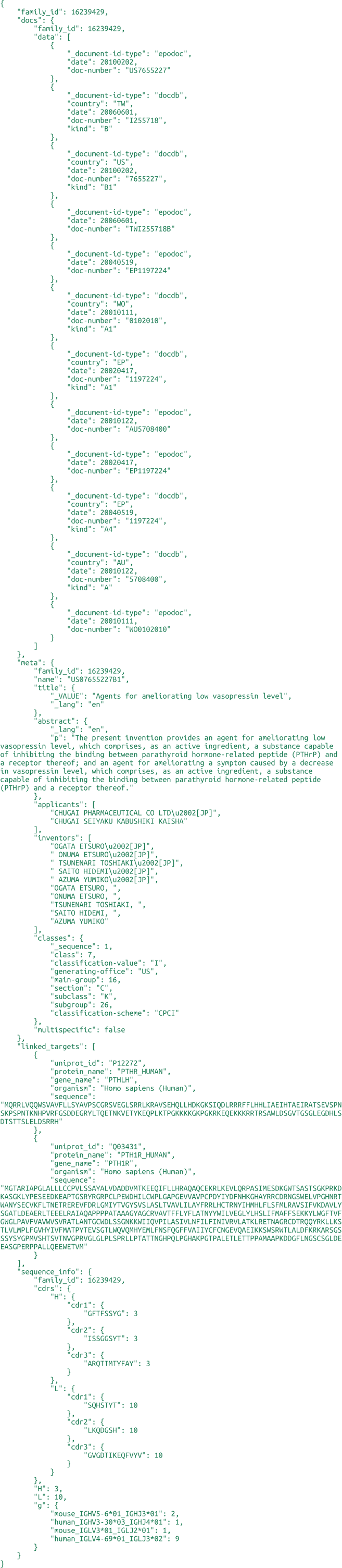 Patents Database (Patents DB) is a comprehensive repository of antibody-related sequences extracted from four distinct patent sequence sources: DDBJ, WIPO, USPTO, and PSIPS. These heterogeneous data formats are integrated with family metadata from the European Patent Office (EPO), resulting in a collection of 4,675,969 total sequences, of which 456,570 are unique, originating from 25,019 patent families.